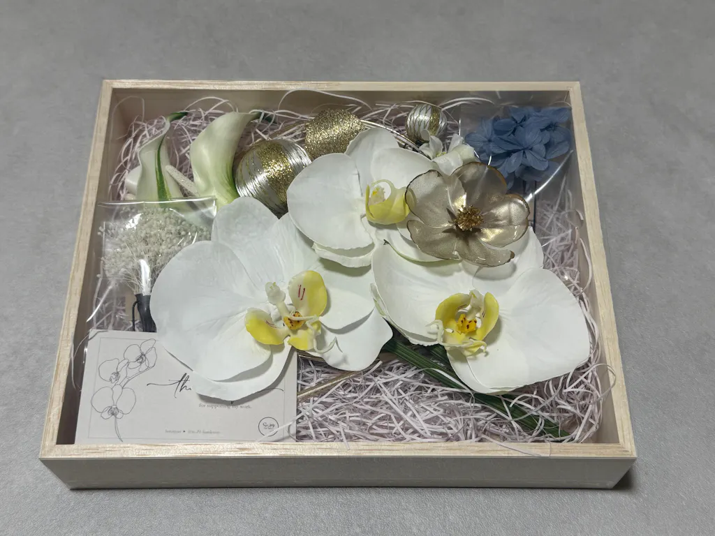 前撮りでのヘアセットに使用し、白無垢に映えてとても可愛かったです!セットの胡蝶蘭はかなりボリュームがあったので追加で購入した小さい胡蝶蘭と組み合わせて使うとバランスが取れてよかったです。購入して大正解でした💯