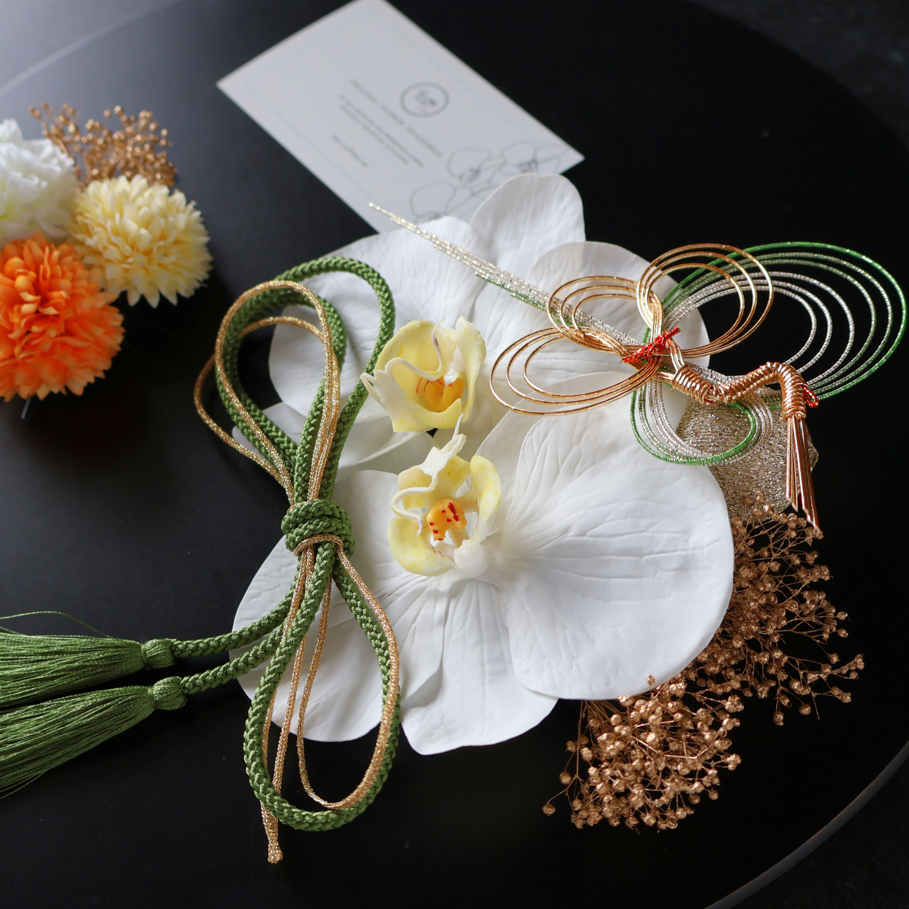 あらかじめモチーフに結んだ状態の水引飾りもご用意しました。