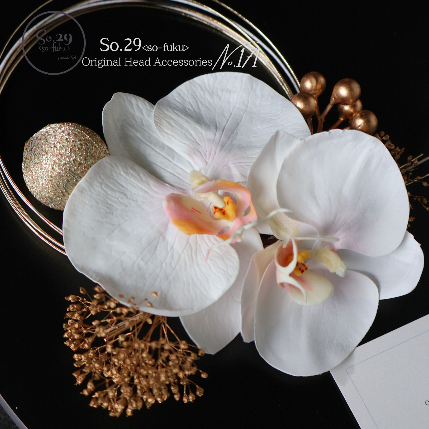 中央が淡いピンクのグラデーションの胡蝶蘭をサイズ違いで2種類使い、タイト目でコンパクトなヘアスタイルでもちょうど良いボリューム感に仕上げたヘッドドレス。