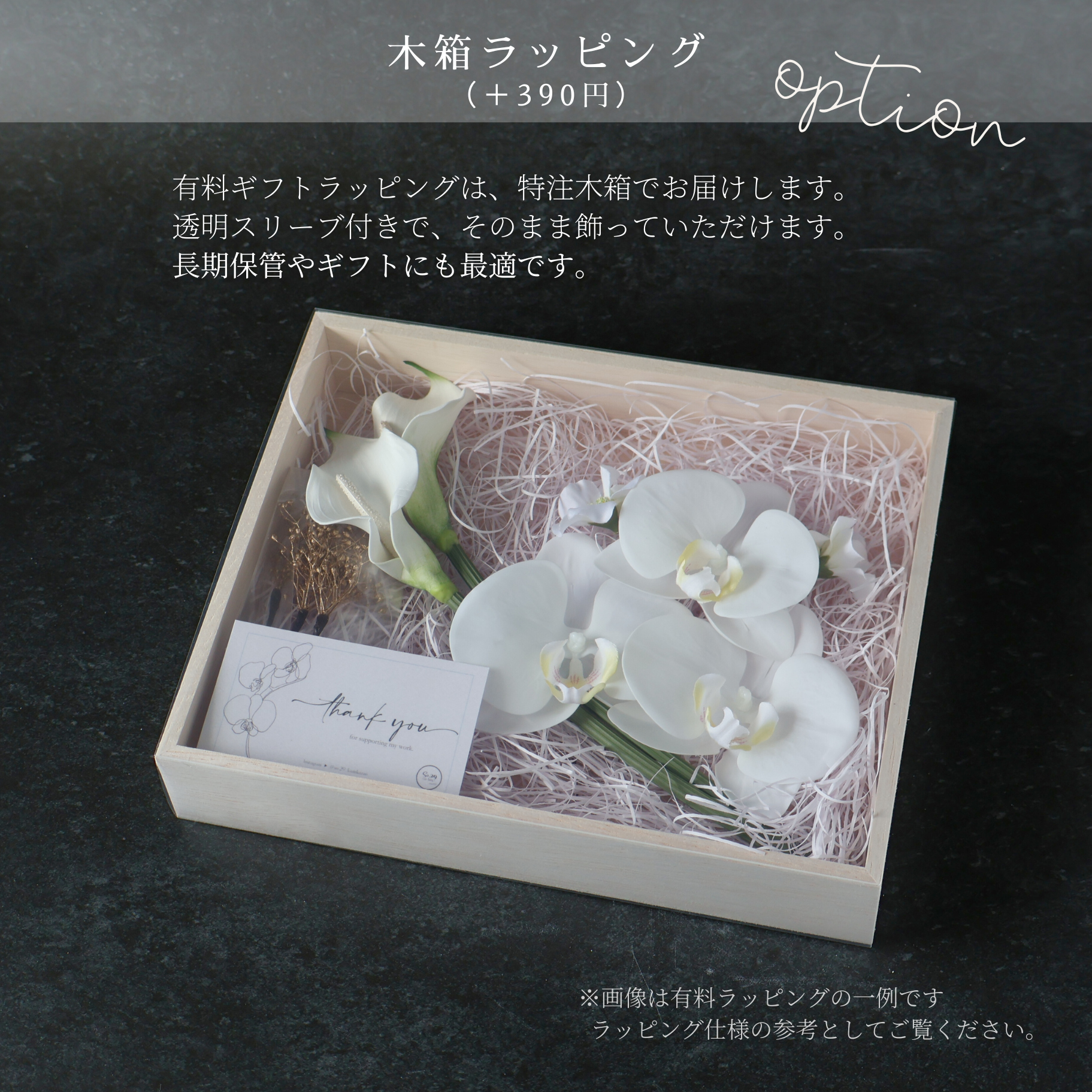 有料ギフトラッピングは、特注木箱でお届けします。 透明スリーブ付きで、そのまま飾っていただけます。長期保管やギフトにも最適です。