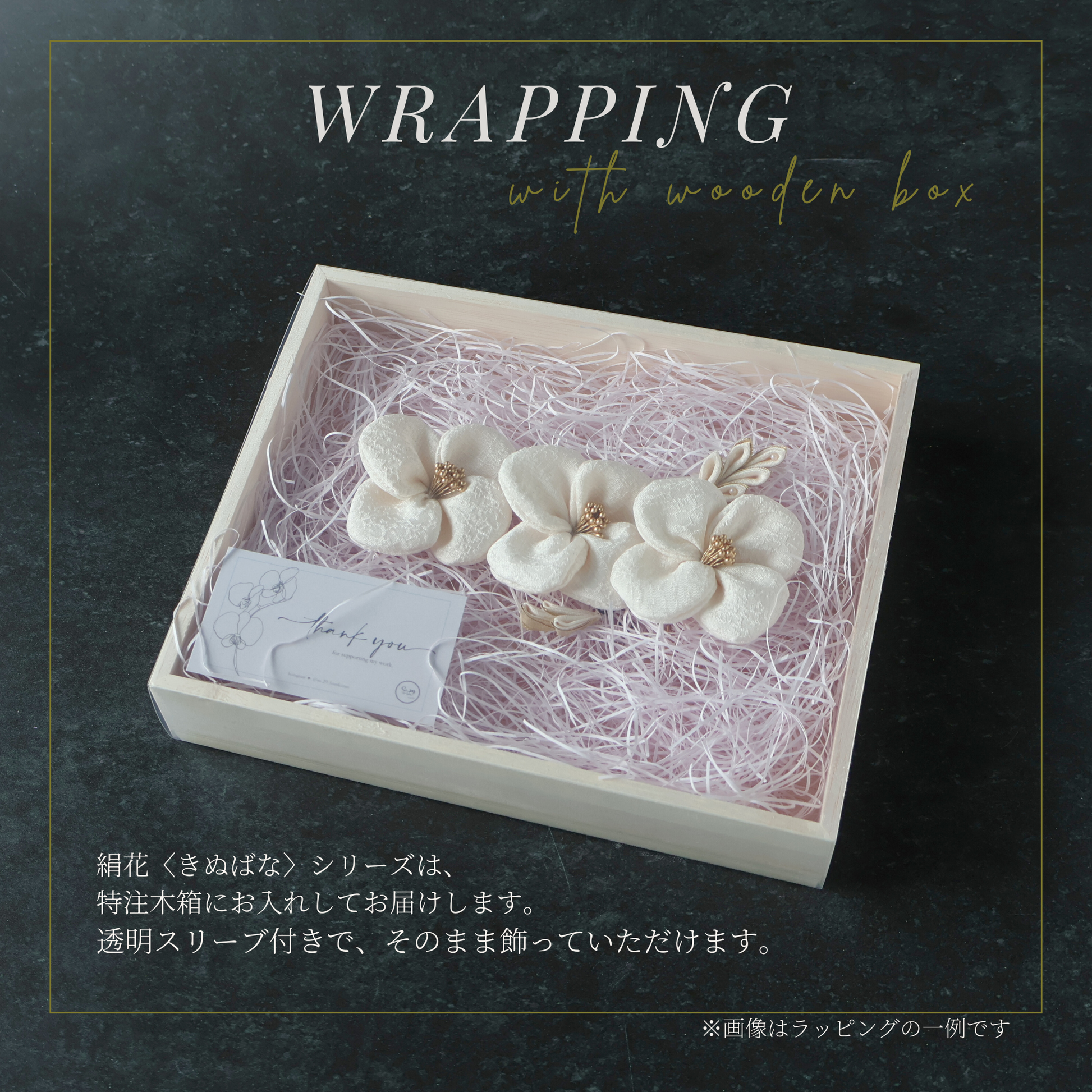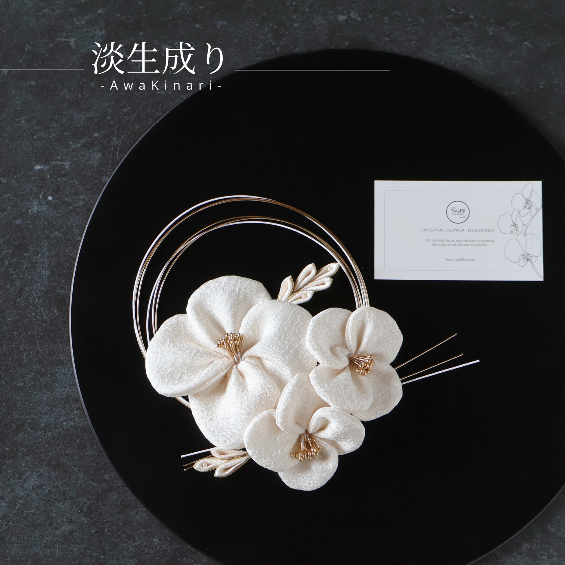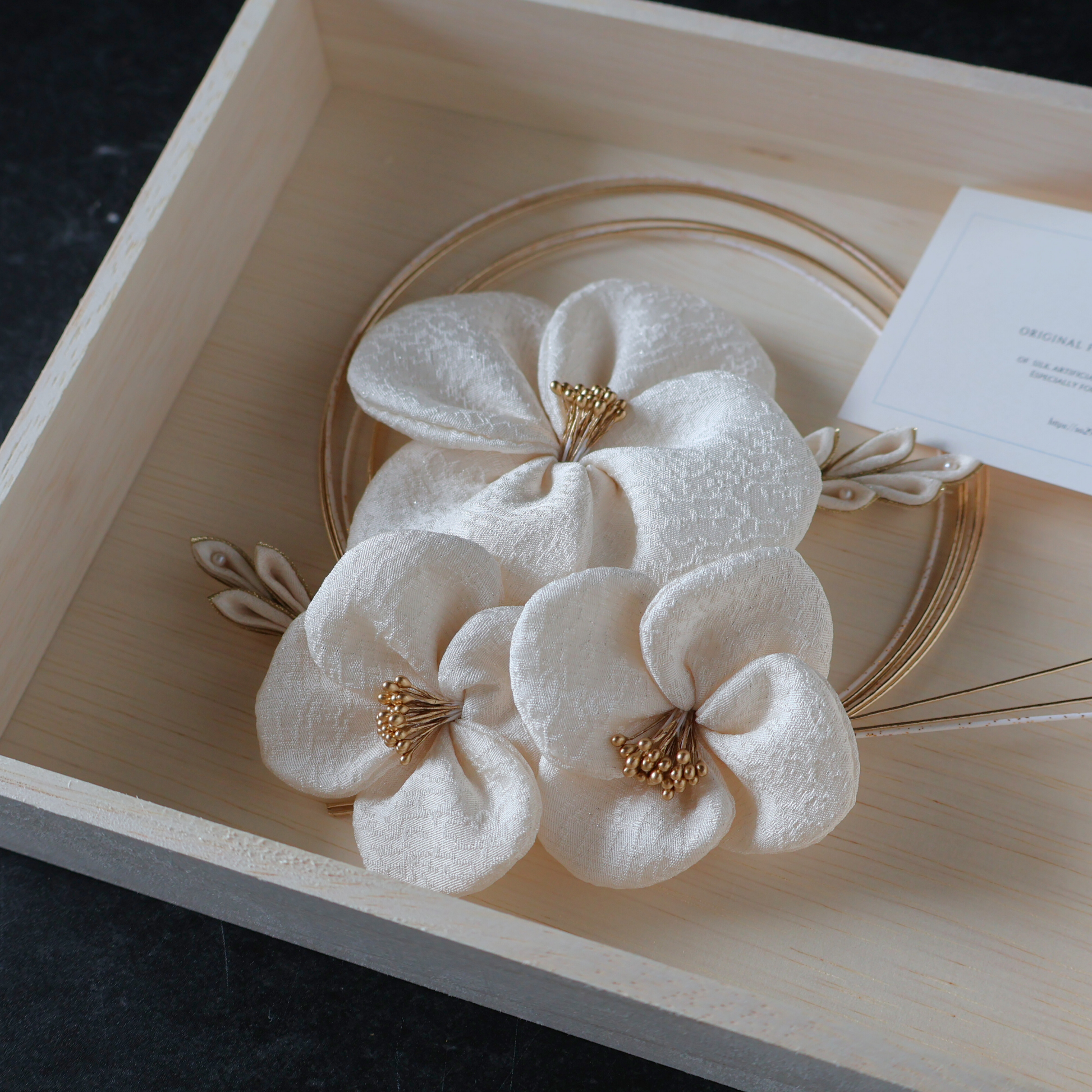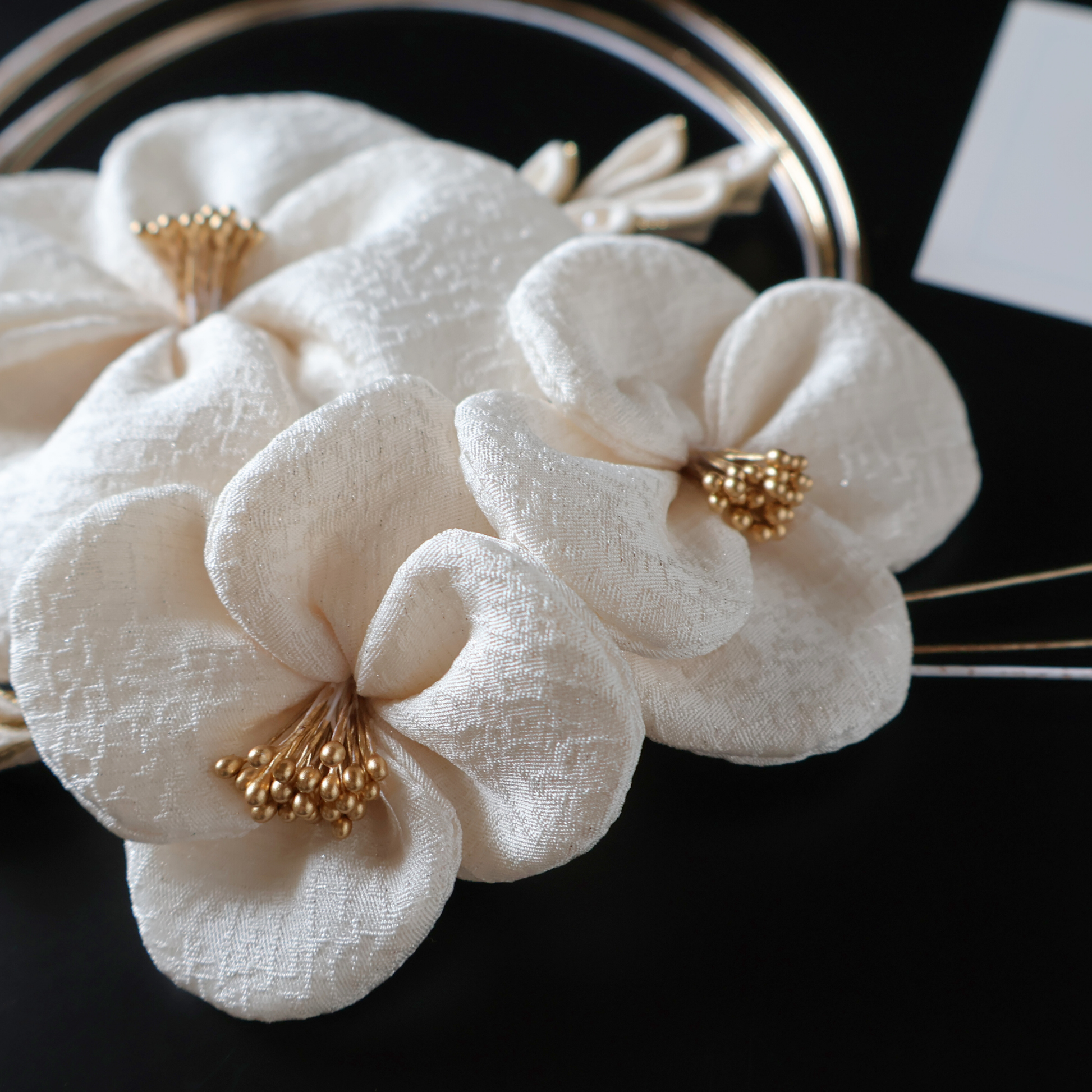 - 髪に飾り付ける際は花部分ではなく、ワイヤー(またはUピン)部分を持って優しくお取り扱いください