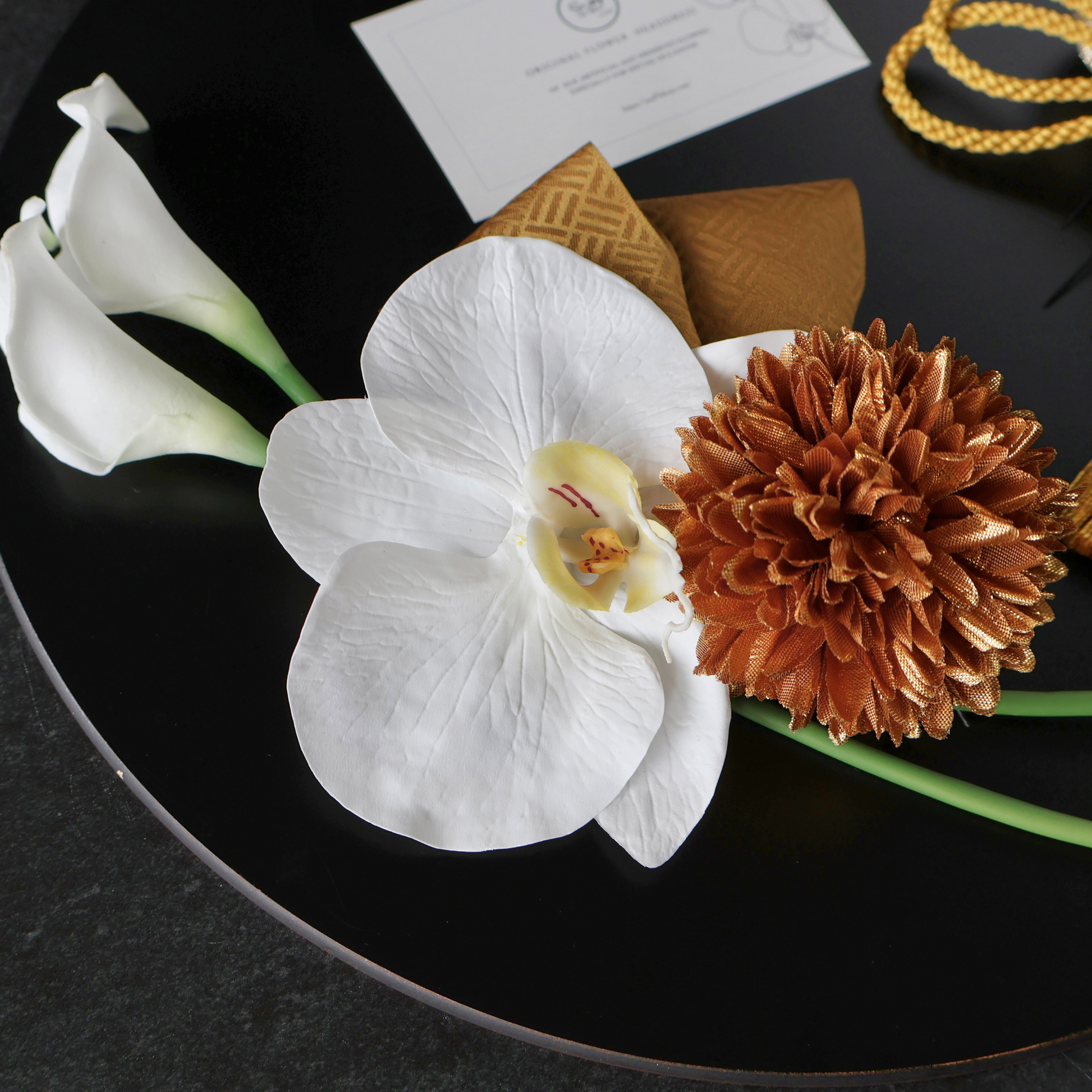 Lサイズの蘭が2輪セットになった商品に、Sサイズを1輪、Mサイズを1輪追加いただくなど、サイズ違いの蘭を追加していただくとバランス良くアレンジいただけます。