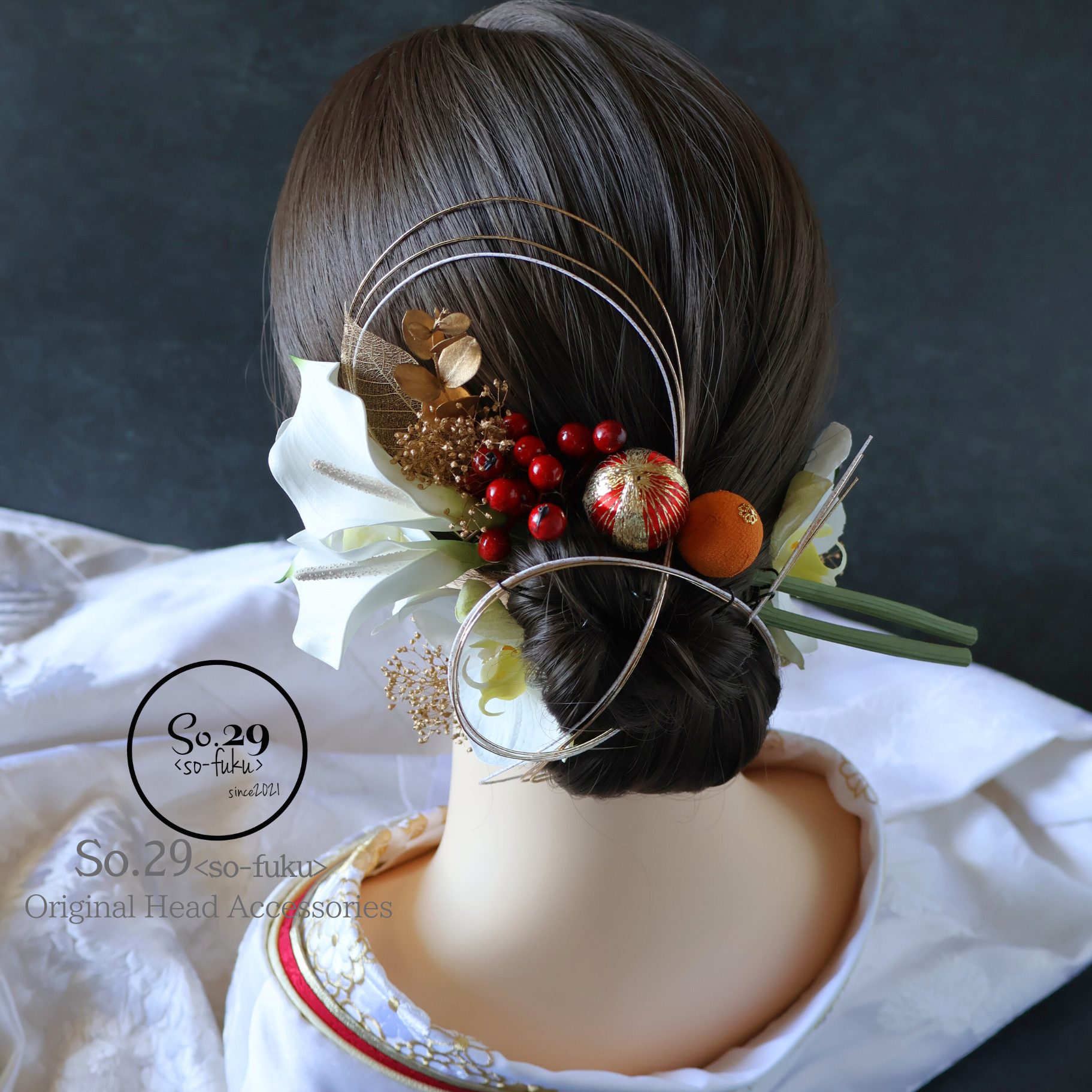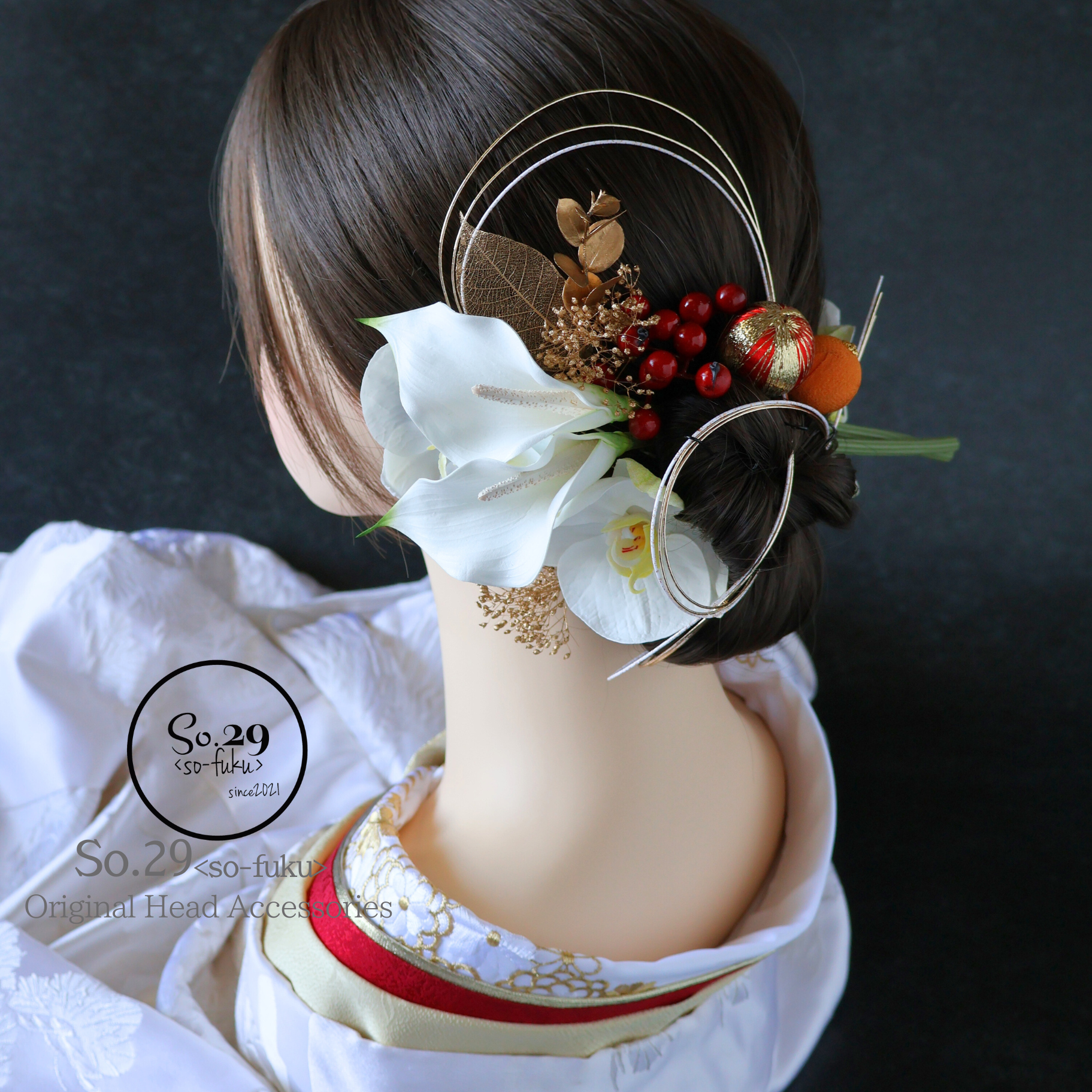 長めにカットした生花のようなカラーリリーを髪に挿すモダンなスタイルに、和玉や水引といった伝統的なパーツを巧みに組み合わせることで、現代的な趣と古典的な美しさが絶妙に融合したデザインです。