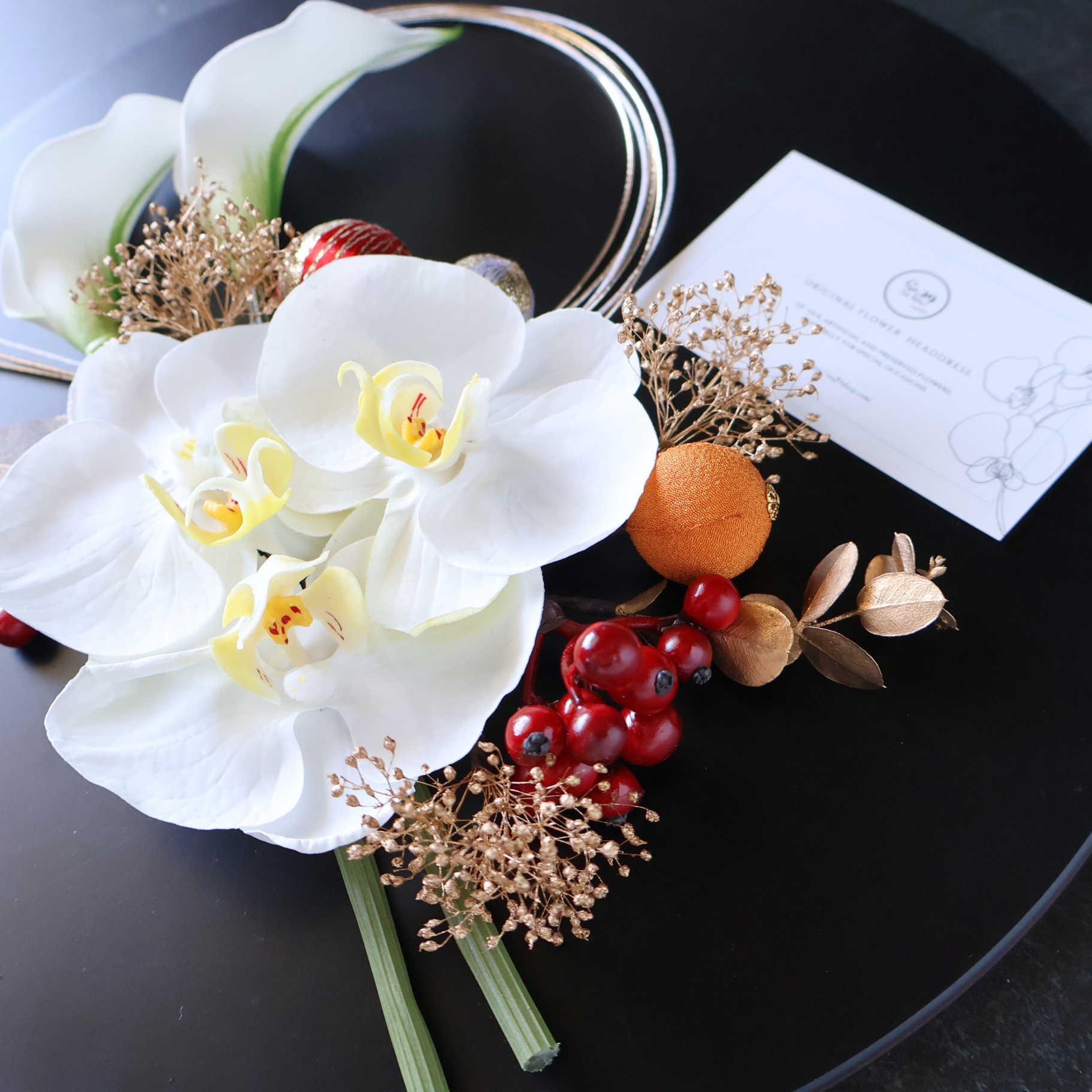 - 髪に飾り付ける際は花部分ではなく、ワイヤー(またはUピン)部分を持って優しくお取り扱いください