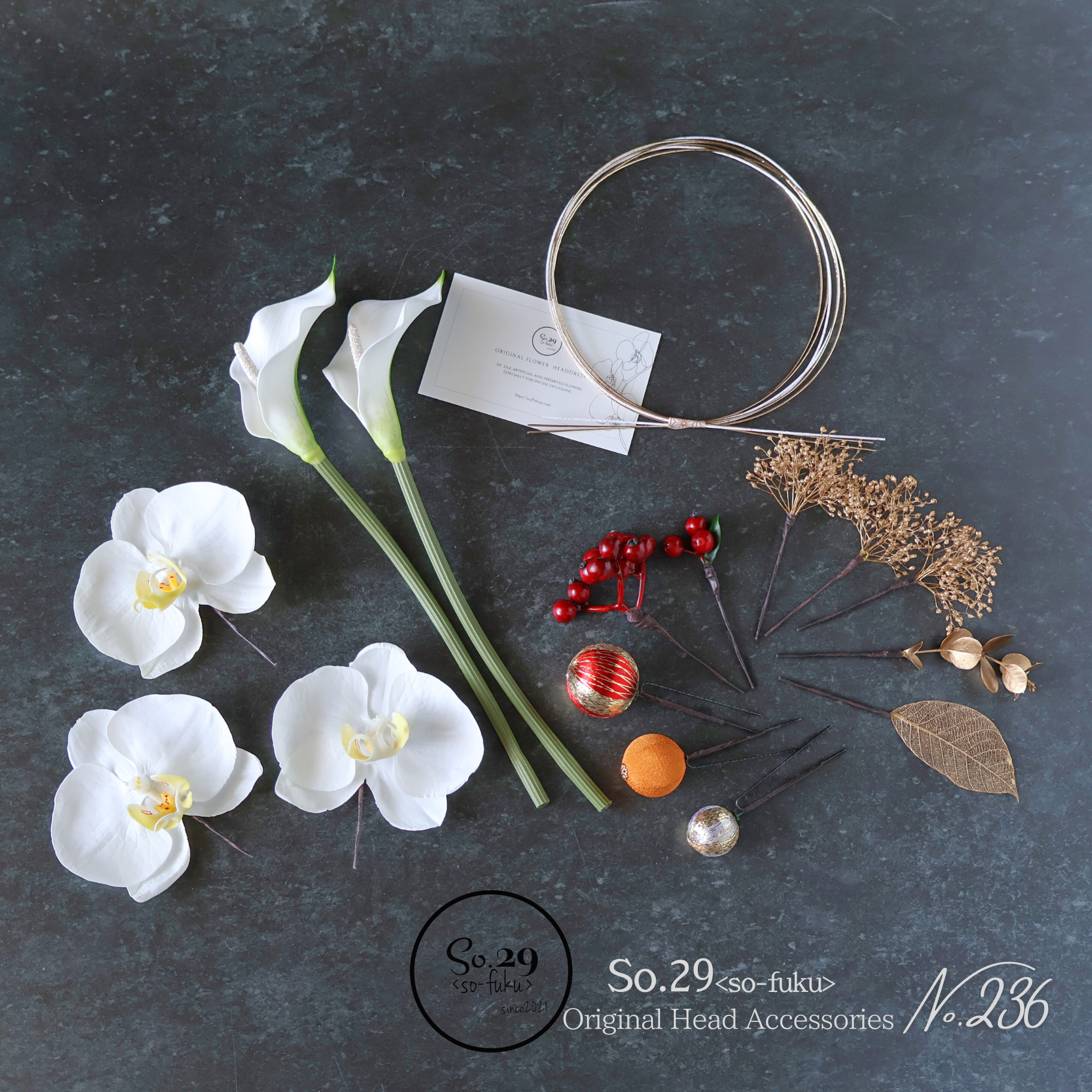 パーツは一つずつ独立してワイヤーまたはUピンに取り付けていますので、ヘアスタイルに合わせてお好きな位置に必要な分だけアレンジ可能です。