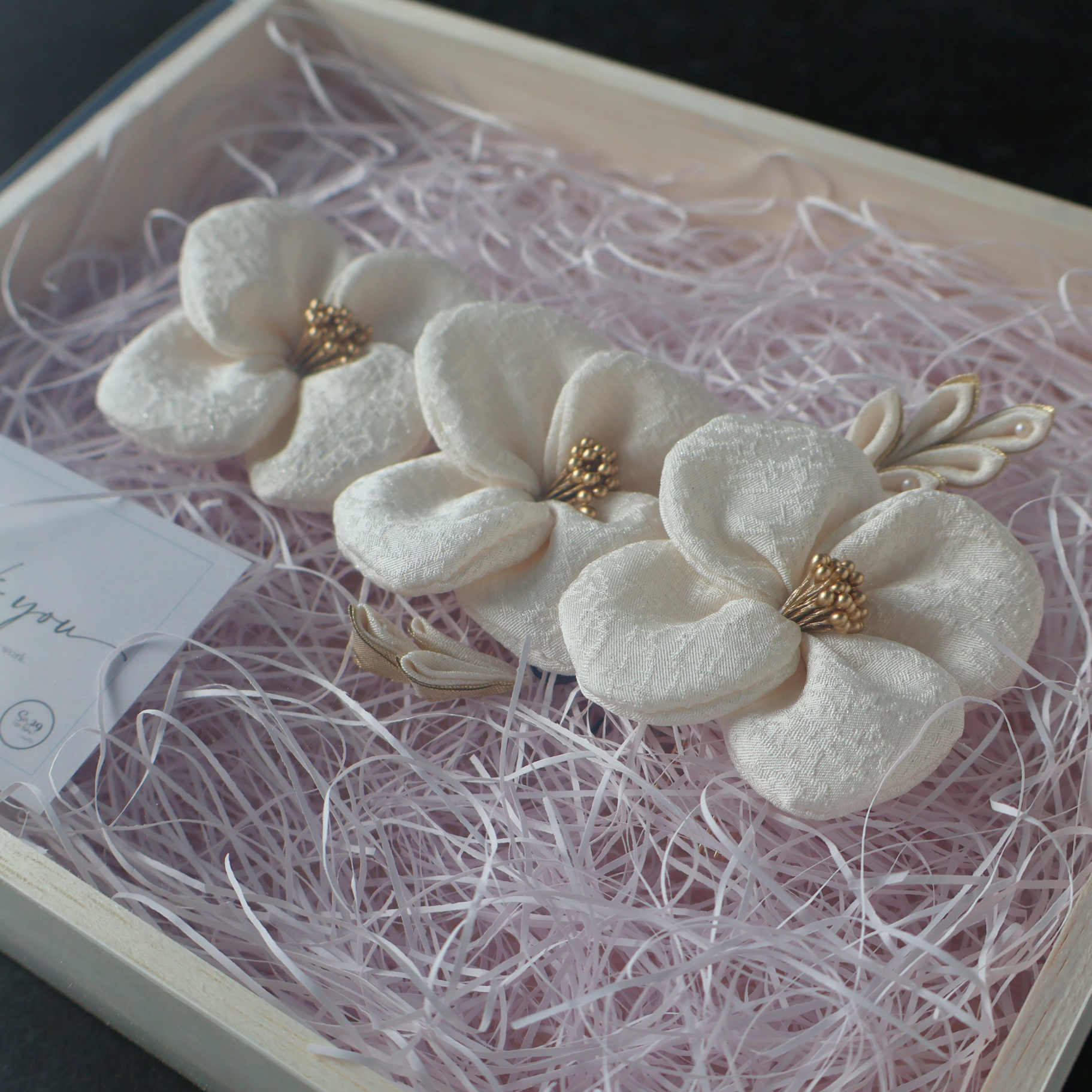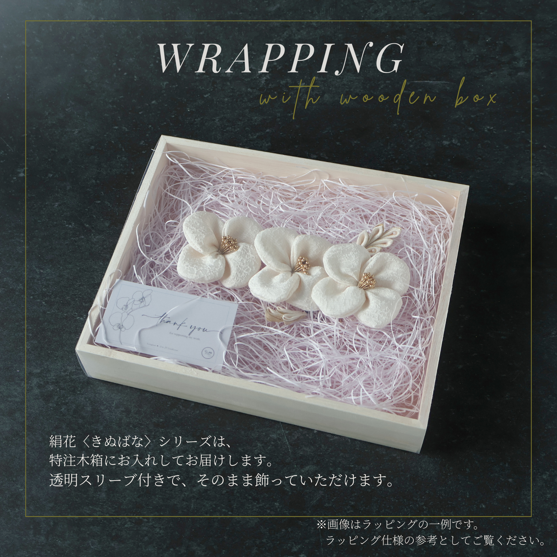 ギフトにもぴったりの、専用の特注木箱にお入れしてお届けします。木のぬくもりあるボックスが絹花をやさしく守り、ご使用後もそのまま飾っていただけます。