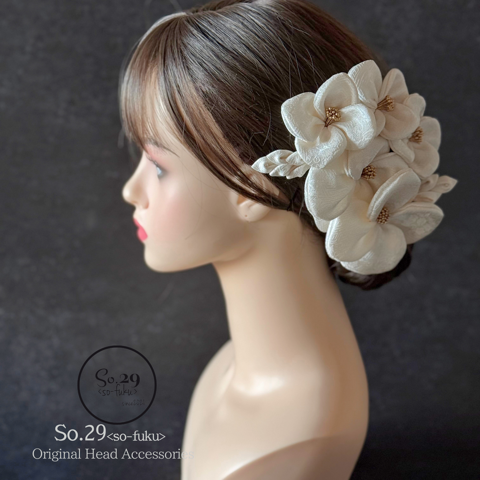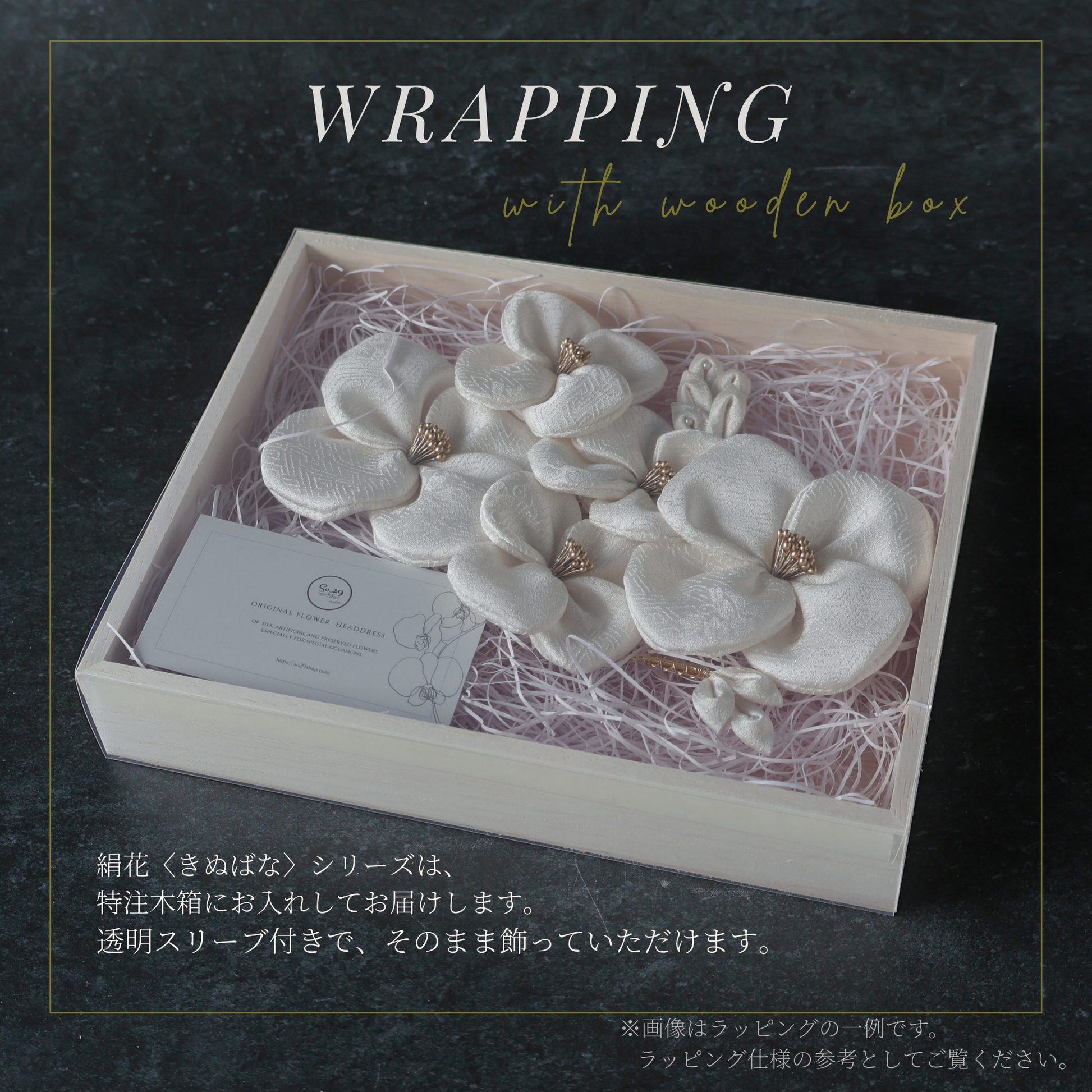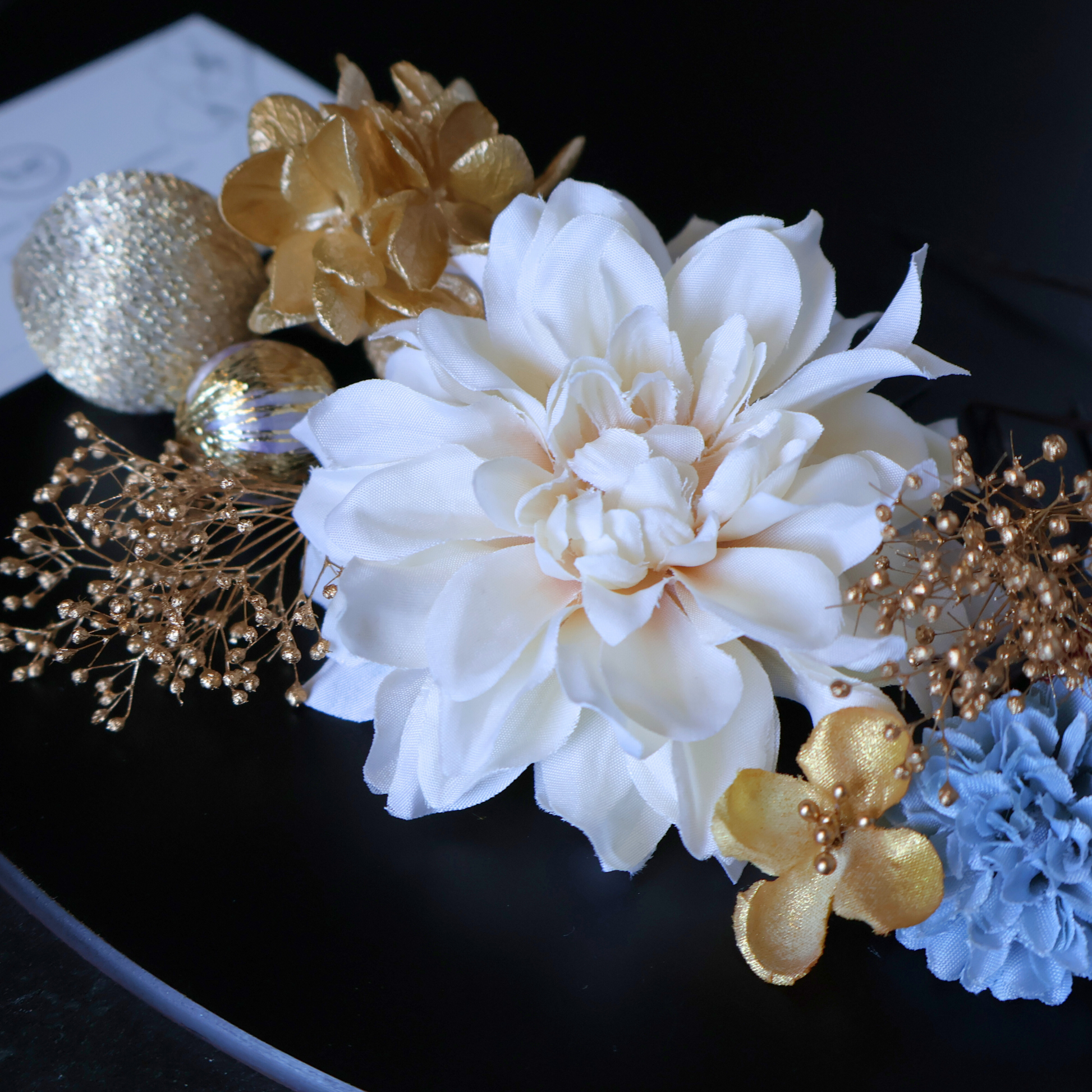 - 髪に飾り付ける際は花部分ではなく、ワイヤー(またはUピン)部分を持って優しくお取り扱いください