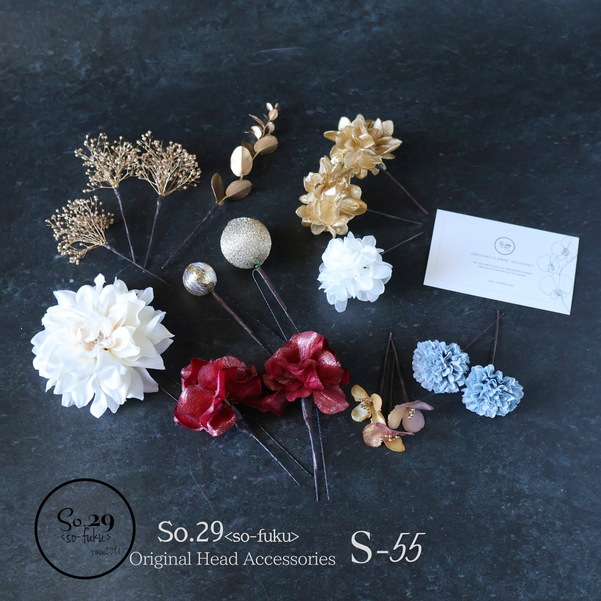 - 一つひとつのパーツにはワイヤーが入っていますので、お花の1cm下辺りから曲げることができます。ヘアスタイルにフィットするよう、お花の角度や向きなどを調整しながら飾り付けてください(玉かんざしなど、曲げられないパーツもあります)