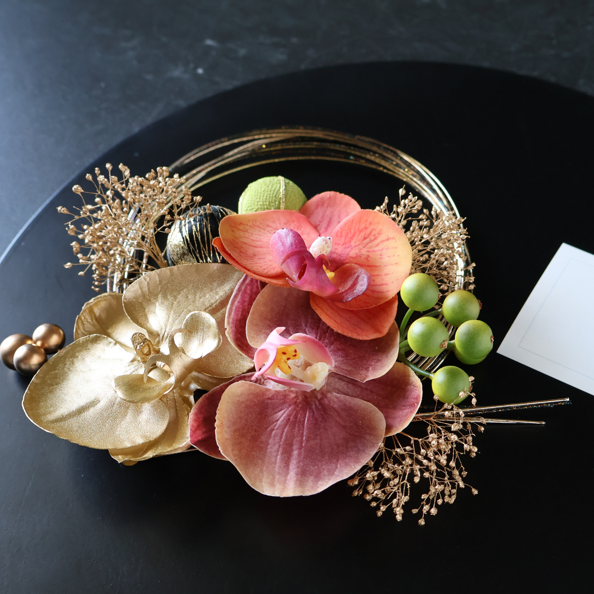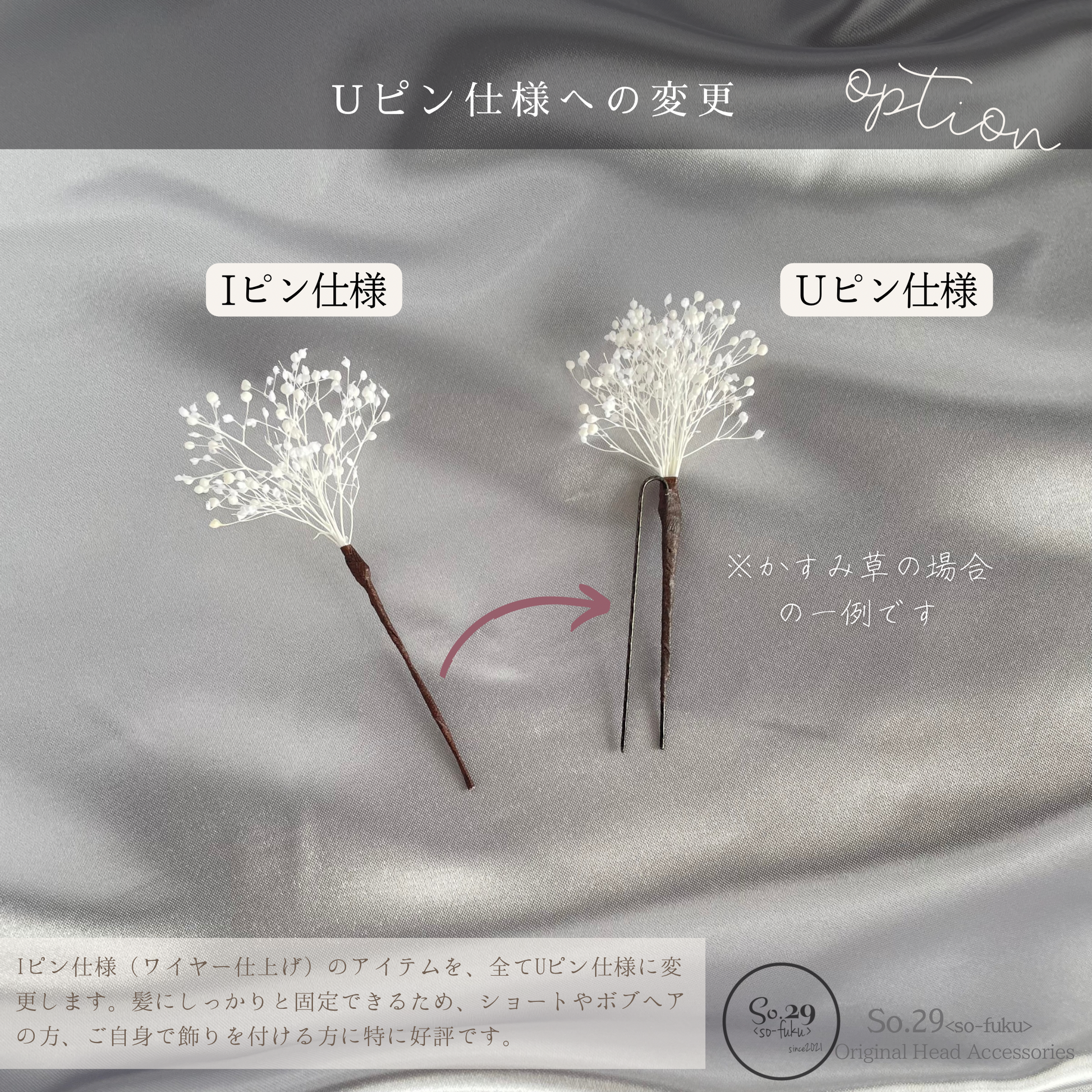 - 髪に飾り付ける際は花部分ではなく、ワイヤー(またはUピン)部分を持って優しくお取り扱いください