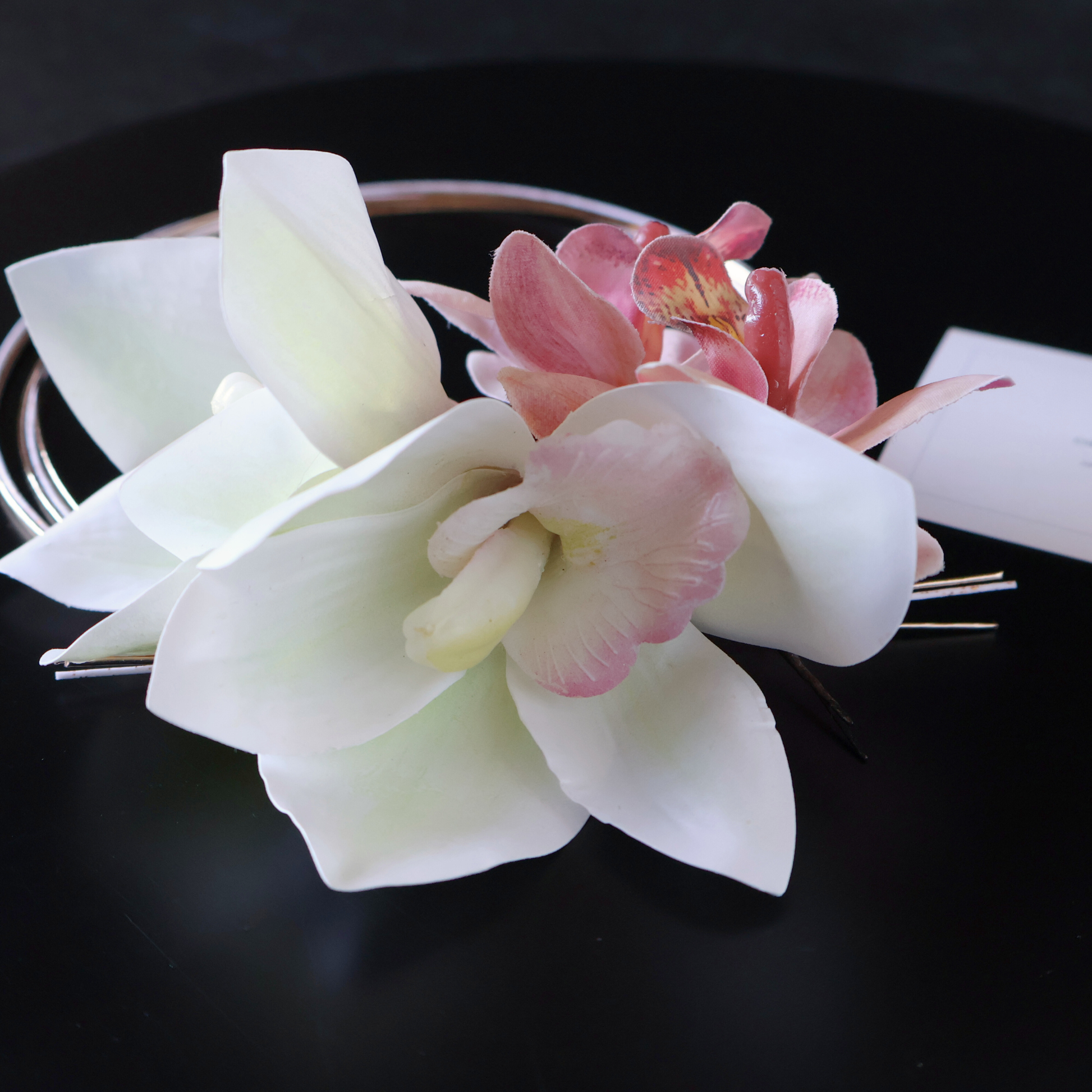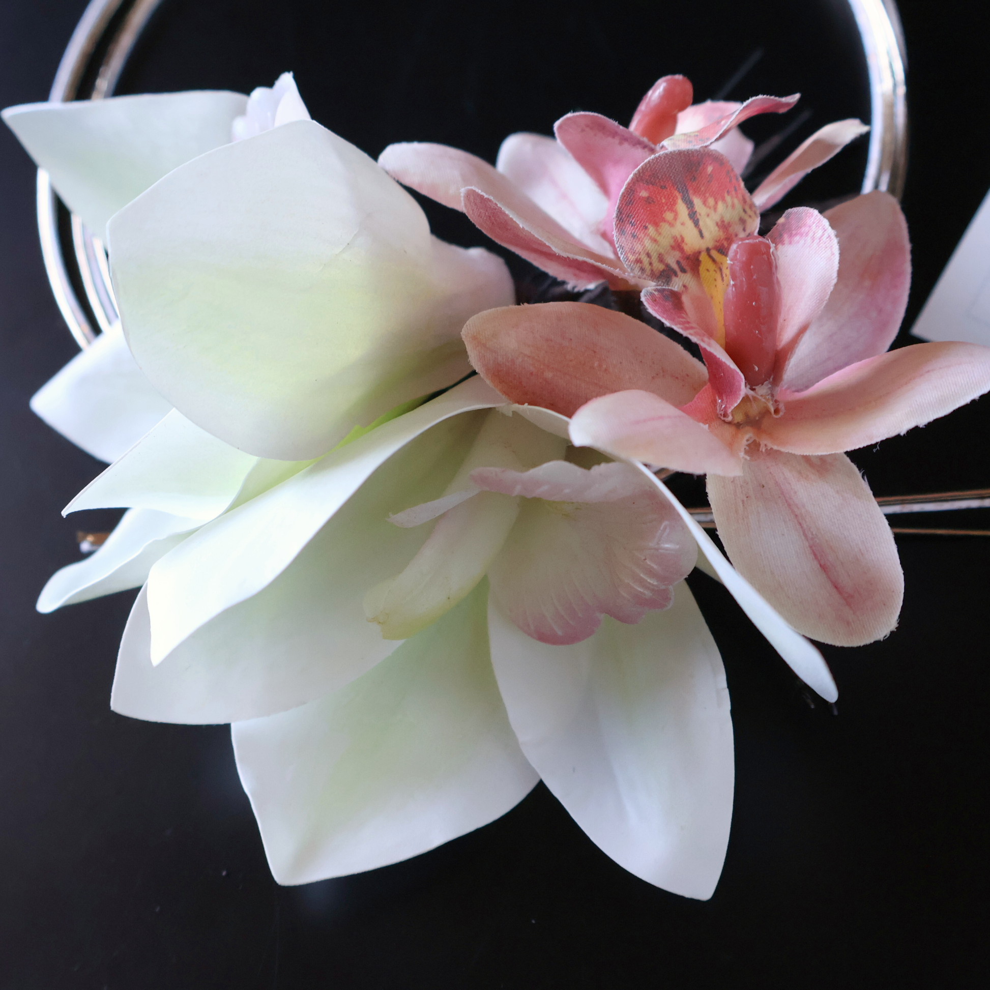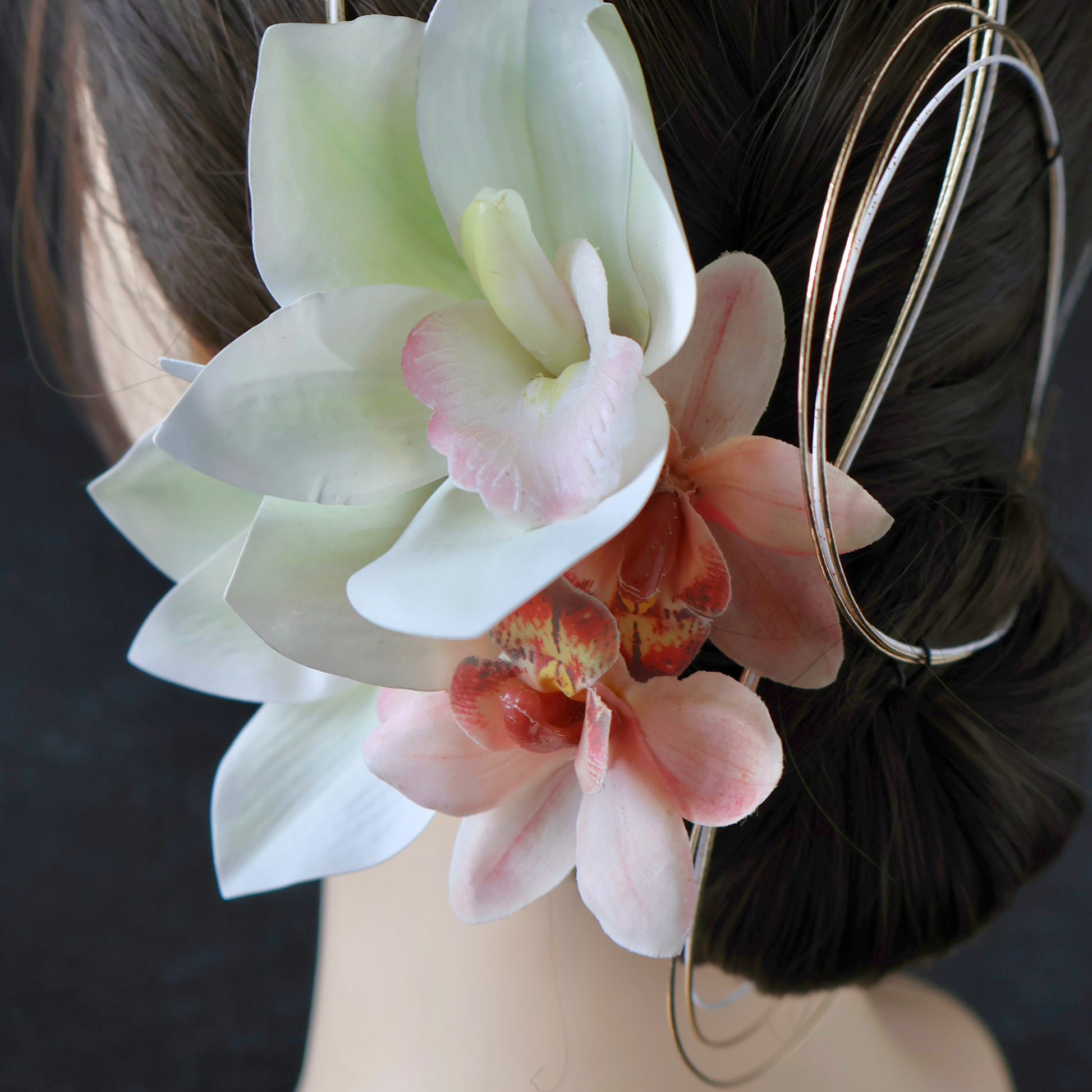 - 髪に飾り付ける際は花部分ではなく、ワイヤー(またはUピン)部分を持って優しくお取り扱いください